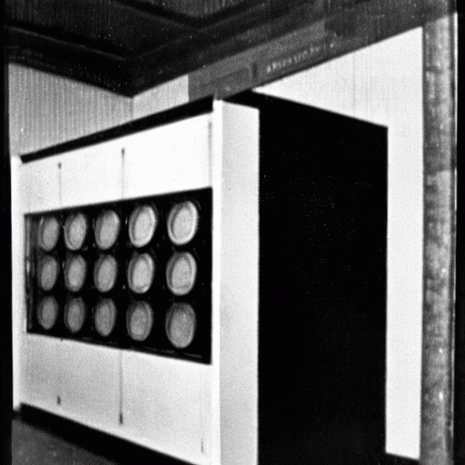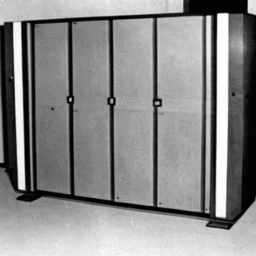 На изображении представлены шкафы, предположительно относящиеся к обслуживающей системе регистров 80–150 машины БРЭМ. Хотя подлинность фотографии не подтверждена документально, отсутствуют убедительные основания считать её подделкой. Вероятно, снимок относится к периоду активной эксплуатации или демонтажа системы в середине XX века.